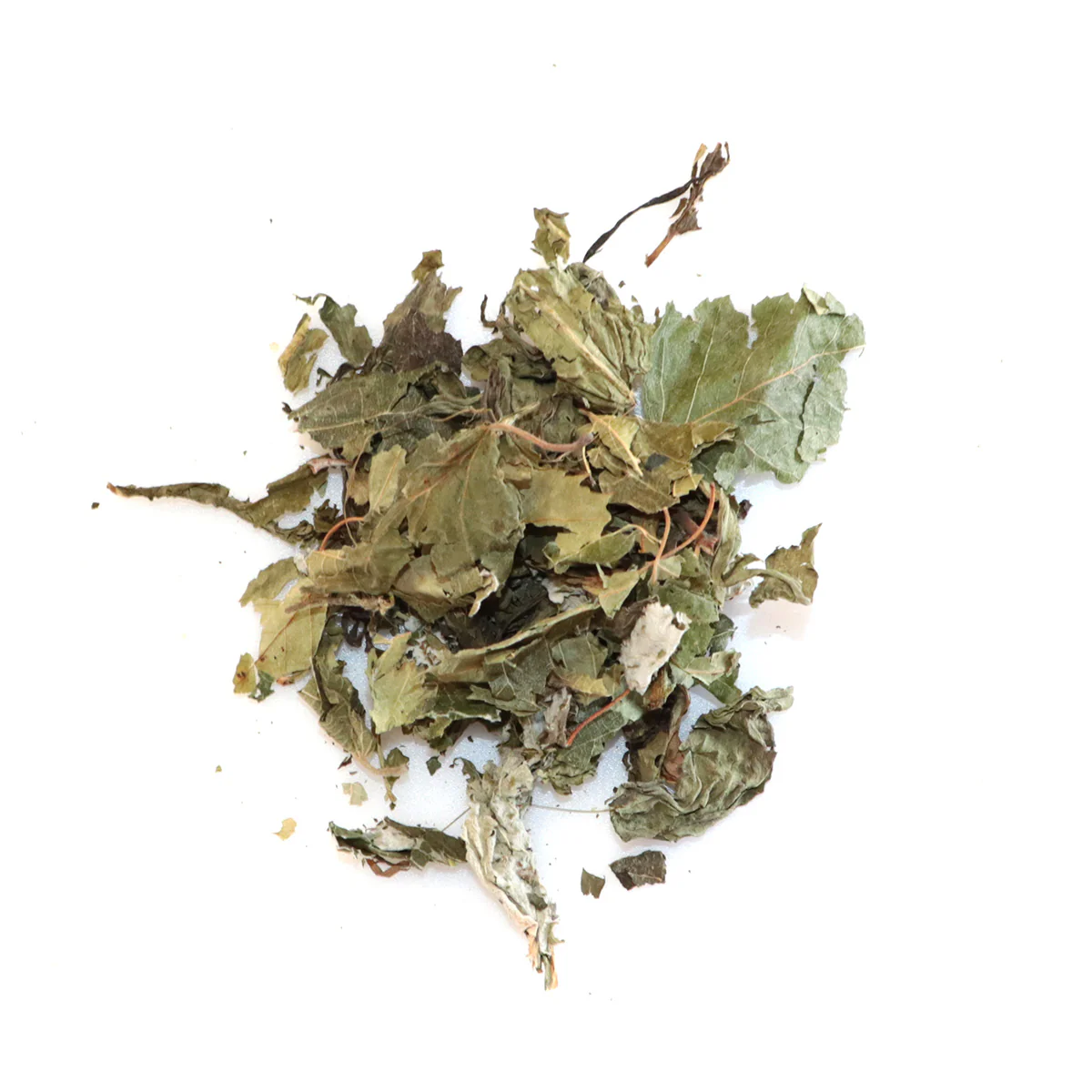 Frambozenblad, berkenblad, hazelnootblad, paardenbloemblad, brandnetelblad en weegbreeblad.