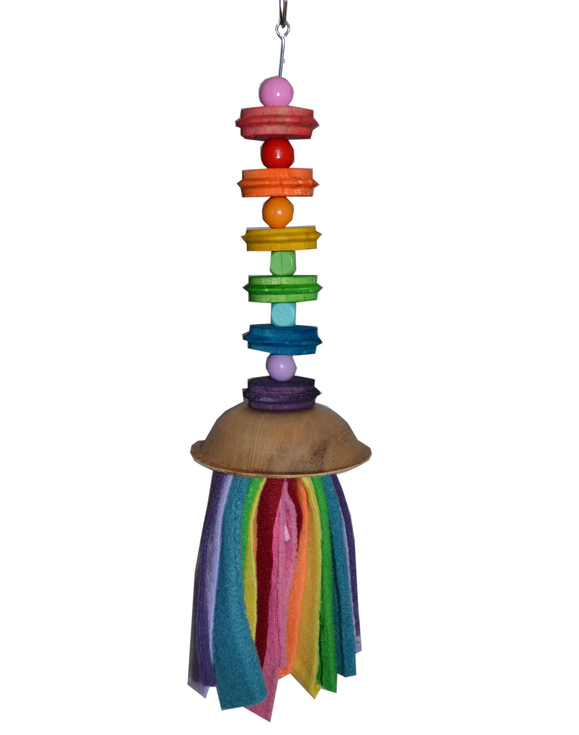 Knaaghanger “Chew the Rainbow”! Gemaakt van gekleurde stukken hout, palmblad en fleece sloopsliertjes. De sliertjes kunnen gebruikt worden als nestmateriaal.