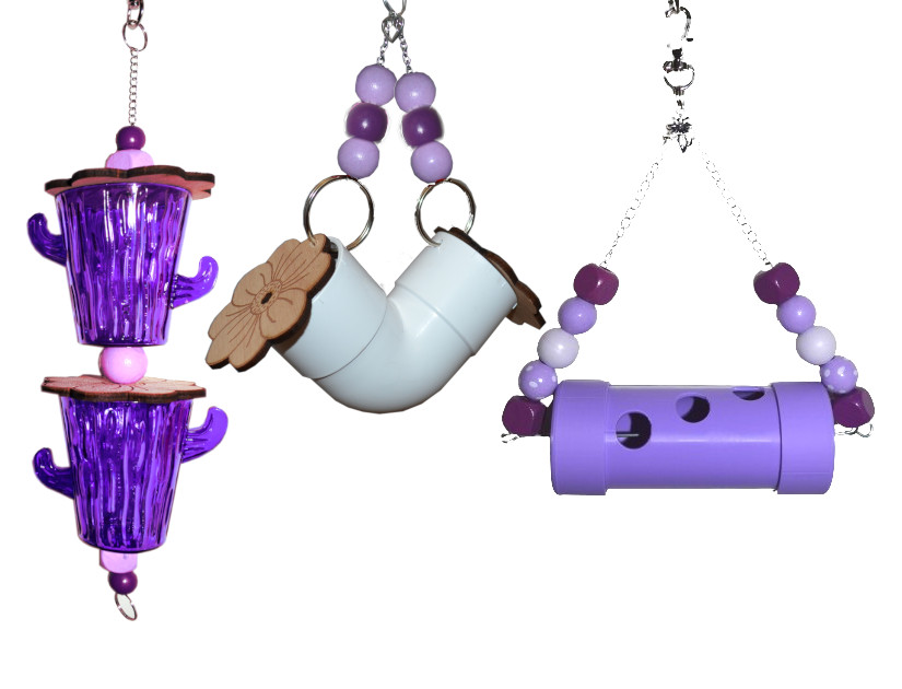 Met deze Grabbelset Pretty Purple is jouw kooi in een mum van tijd helemaal in stijl! Met verschillend handgemaakt foerageerspeelgoed. Met deze set stimuleer je de intelligentie en creativiteit van jouw beestje. Zo hoeft jouw diertje zich zeker niet te vervelen! Verstop snacks, voer en/of nestmateriaal in de speeltjes. Zo moet jouw huisdier, net als in de natuur, werken voor zijn voedsel en nestmateriaal.