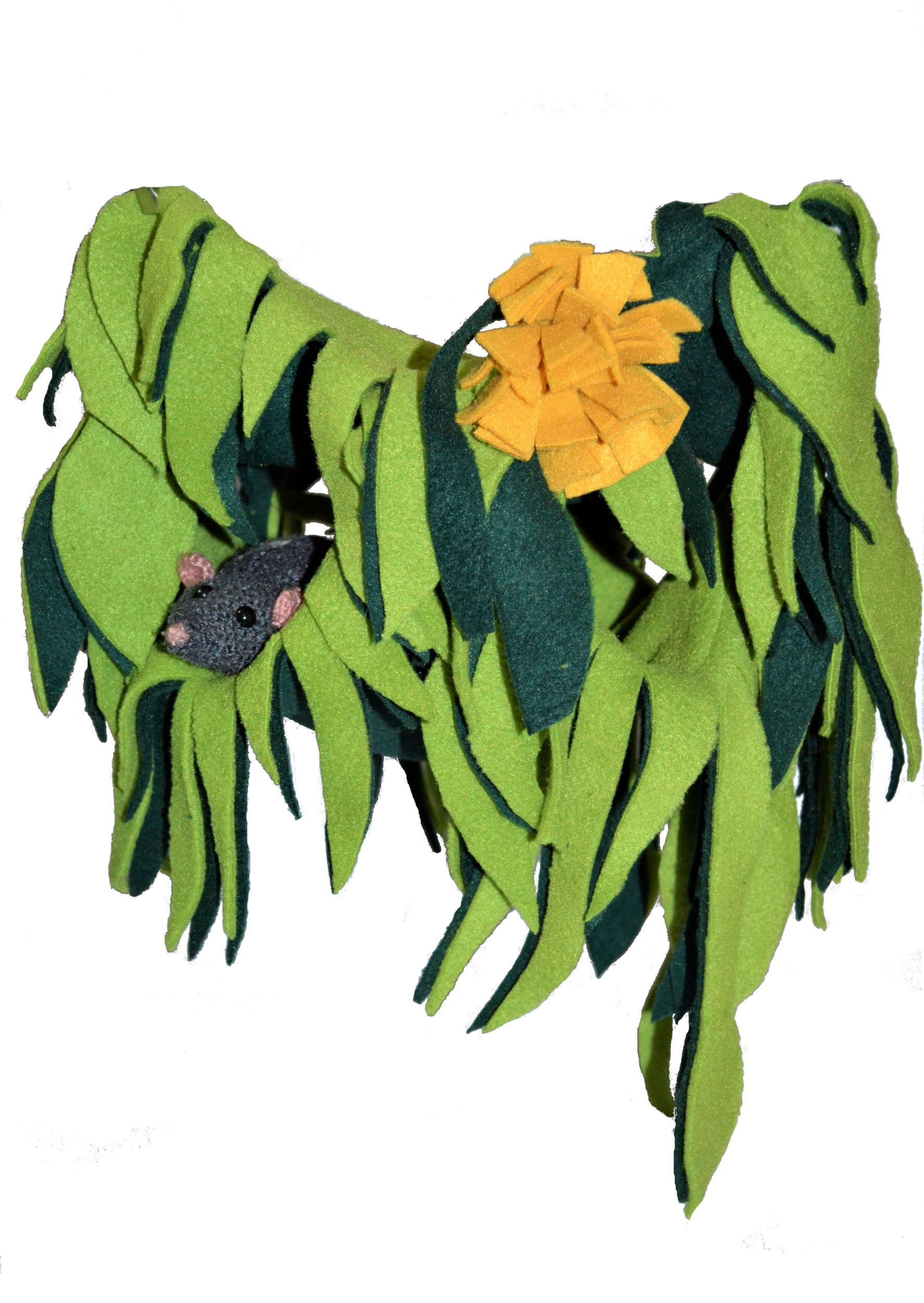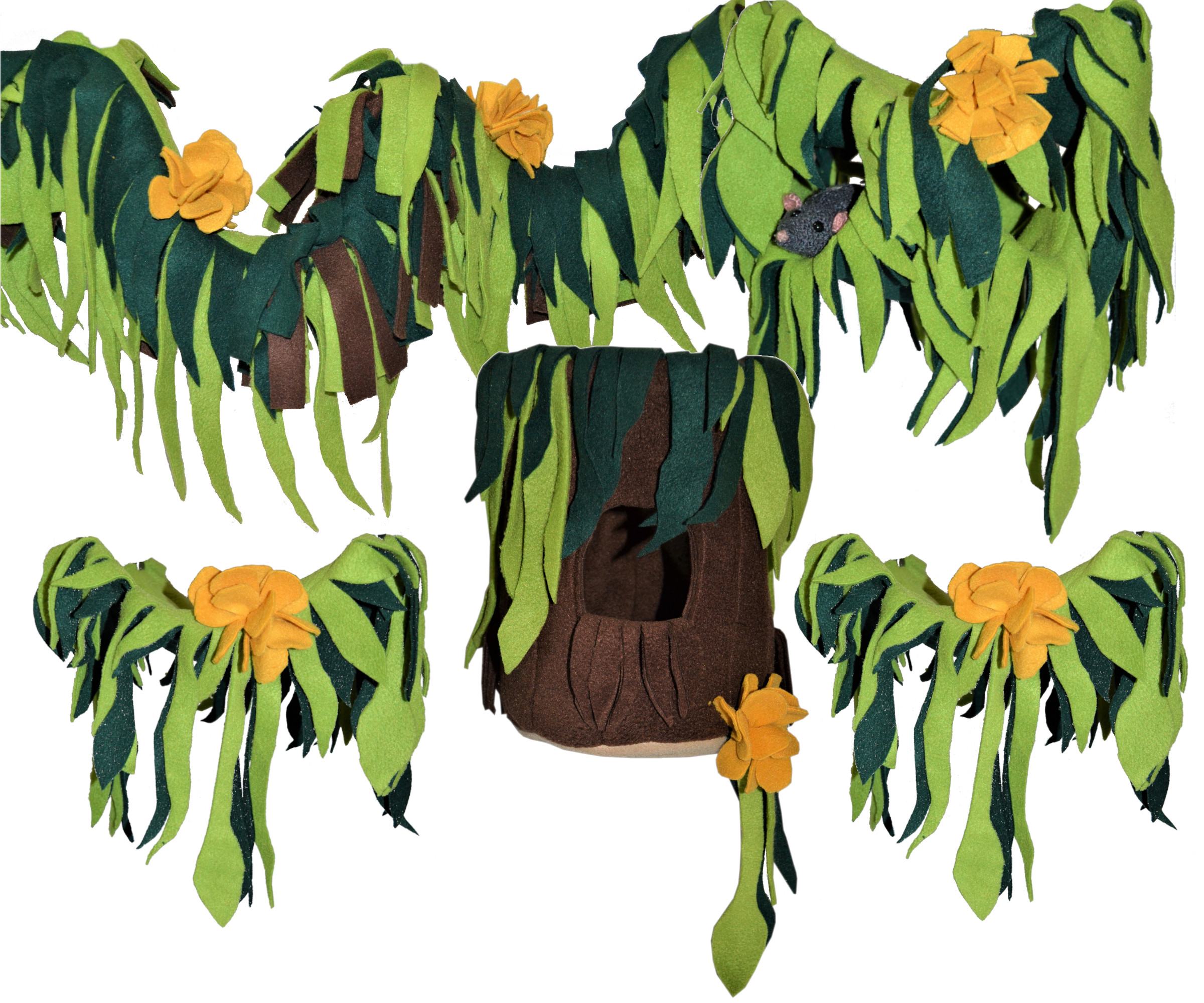 De Jungle Set is een complete, vijfdelige set hangmatten in jungle stijl! Gemaakt van heerlijk comfortabel fleece. Door de blaadjes en sliertjes krijg je met deze set extra verstop plekjes onder je matjes. Ook zijn de blaadjes en sliertjes perfect voor speel- en sloopplezier.